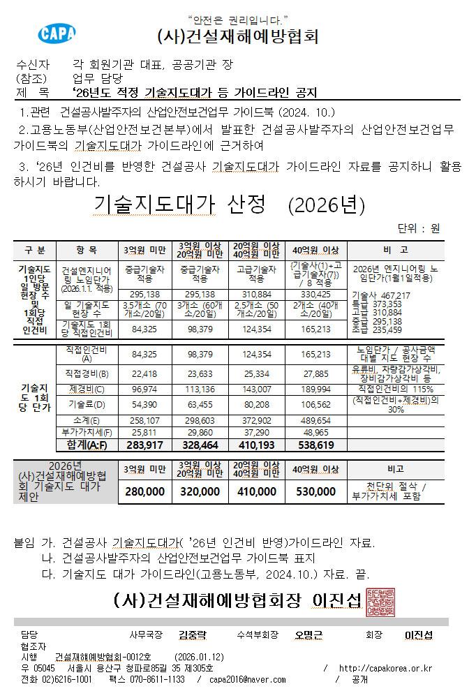 2026년도 건설공사 기술지도대가 가이드라인 공지