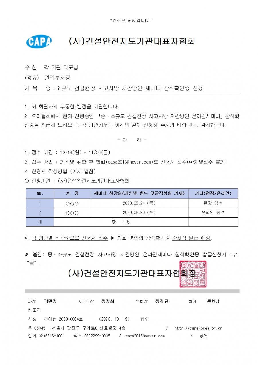 【중·소규모 건설현장 사고사망 저감방안 세미나 참석확인증 신청】