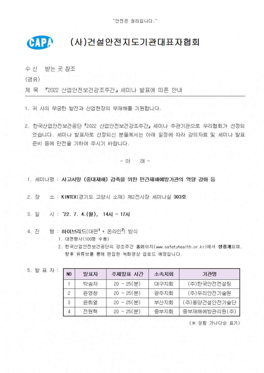 【"2022 산업안전보건강조주간" 세미나 발표에 따른 안내】