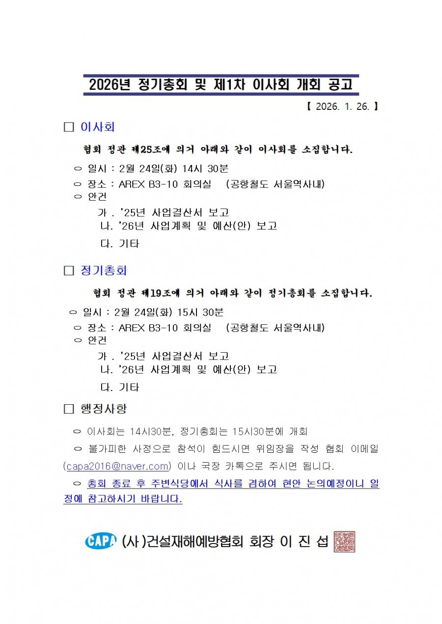 2026년도 정기총회 및 제1차 이사회 소집 공고