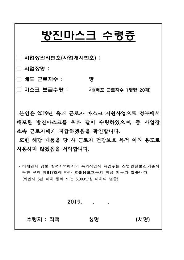 20억미만 공사현장에 대해 마스크를 배포 할 수 있습니다.(근로자 1인당 20개씩)